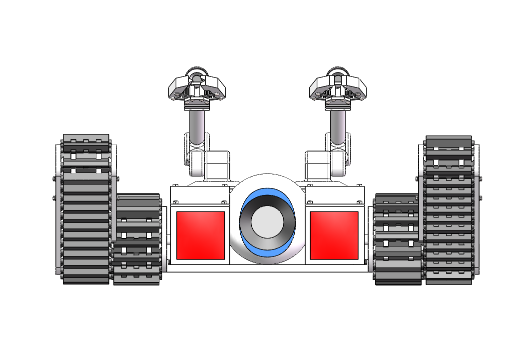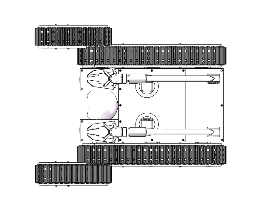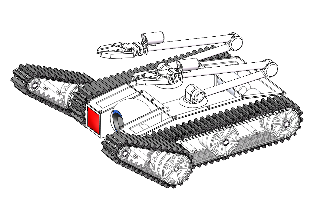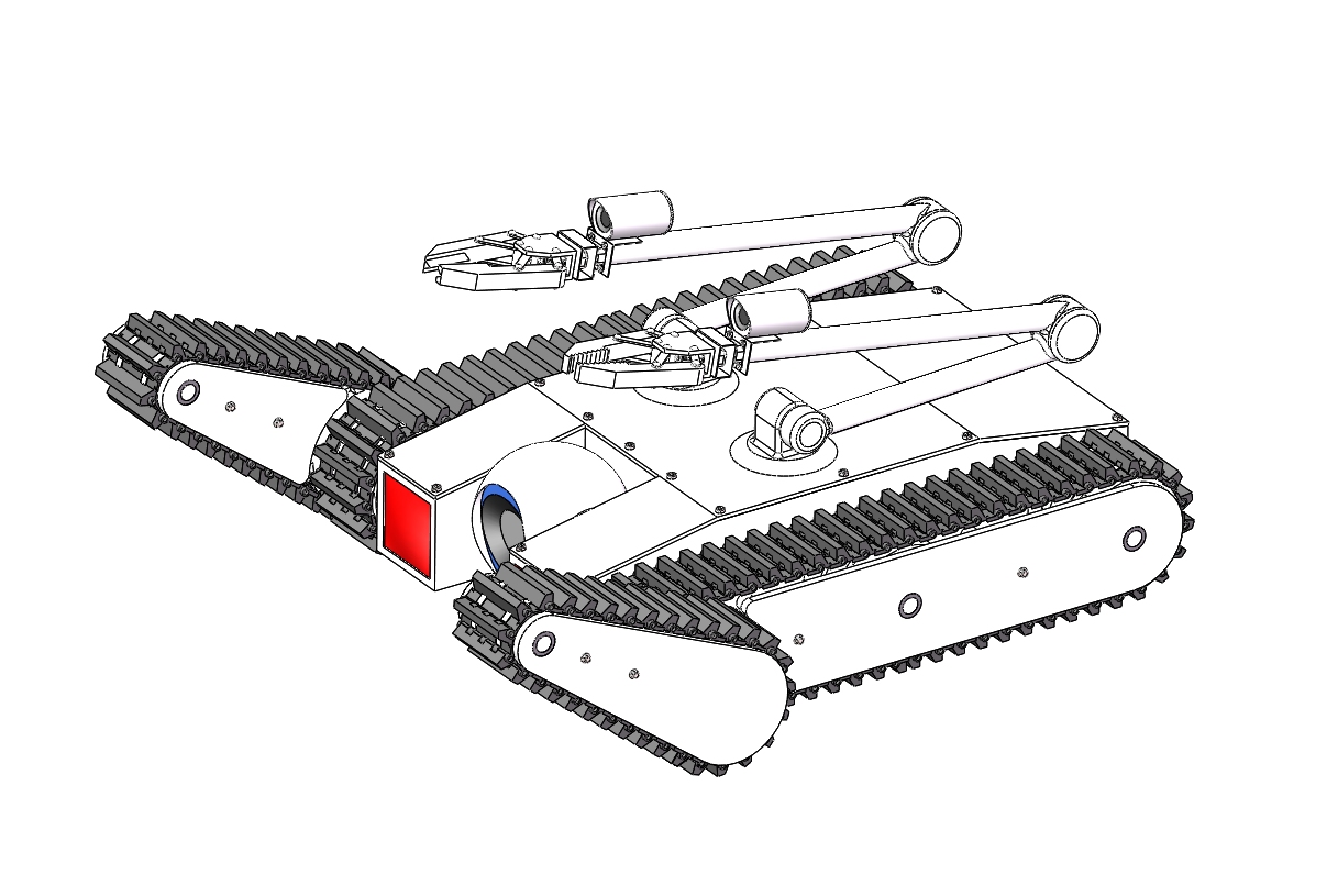 該模型是一款履帶式機械手防爆機器人。采用雙履帶結構,大小履帶配合使用,可實現攀爬障礙物。車體上裝有獨立的攝像頭,可上下擺動,用于行駛過程中,觀察路況。車體上安裝兩個機械臂,分別裝上剪鉗和夾鉗。剪鉗可以剪斷電線等物件、夾鉗可以挾持物件,兩機械臂配合工作可拆裝炸彈。
